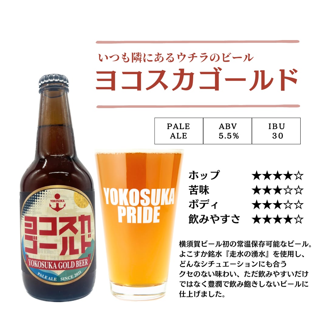 【特徴】横須賀ビール初の常温保存可能なビール。よこすか銘水『走水の湧水』を使用し、どんなシチュエーションでも飲んでいただけるクセのない味わい、ただ飲みやすいだけでなく豊潤で飲み飽きしないビールに仕上げました。